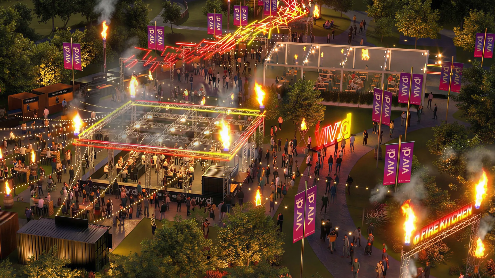 Local restaurants including Firepop, in-demand Greek taverna Olympic Meats and KOI Dessert Bar will be grilling, smoking, charring and burning their way through delicious menus, alongside past Vivid Fire Kitchen favourites like Filipino skewers Hoy Pinoy, Mr Spanish Churros, Burn City Smokers and Gelato Messina.