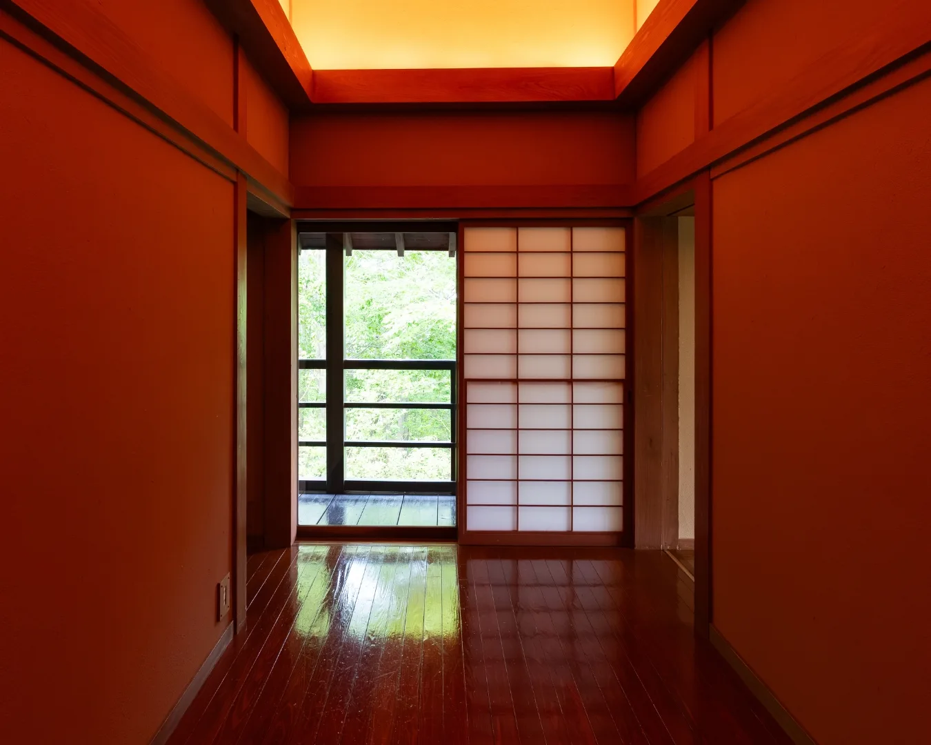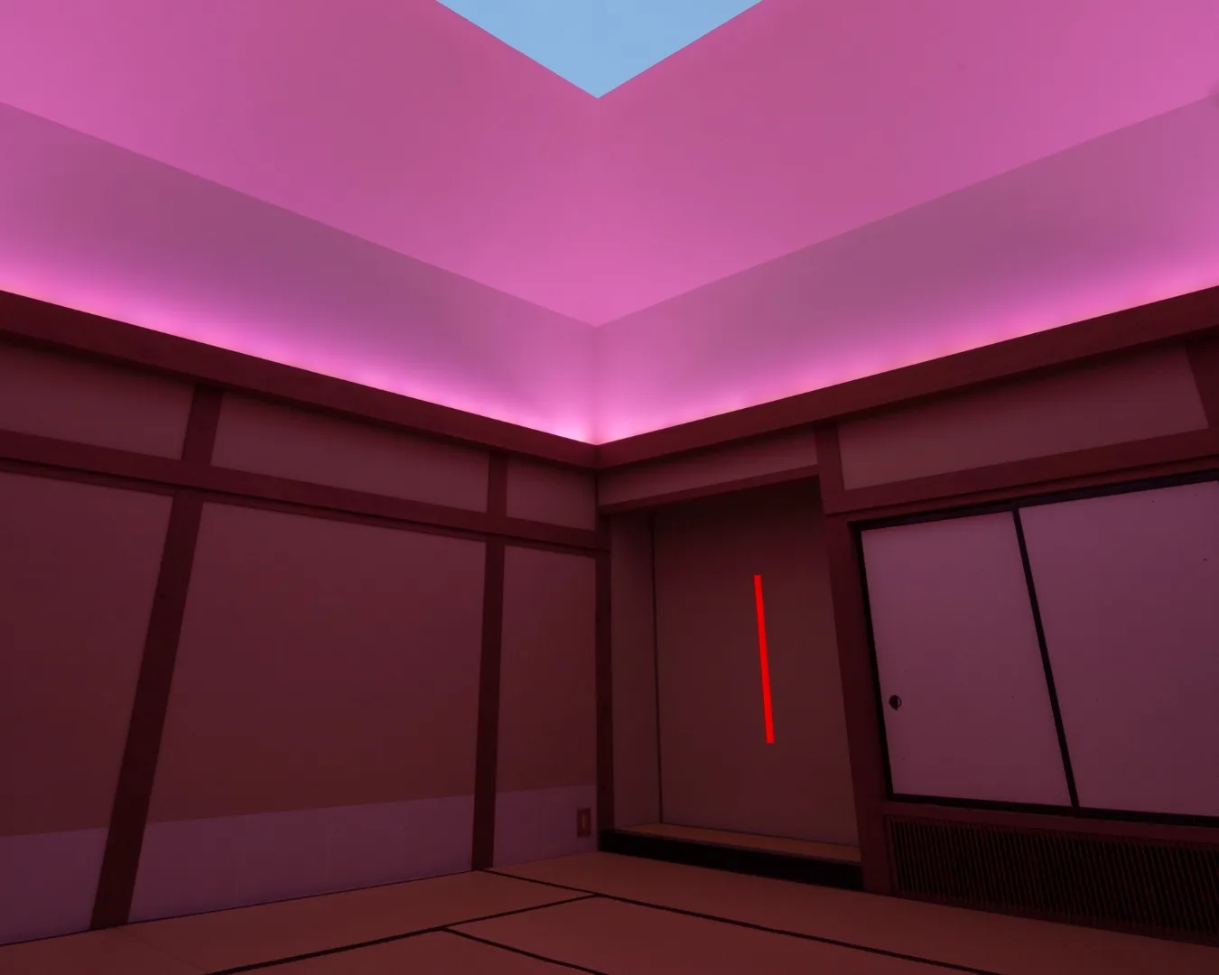 The light show slowly pulses and sometimes the room is bathed in two tones at once, like a gas flame’s multiple hues. The walls turn bright as grapefruit soda, then creamy white like a vintage silk blouse. The sky is shimmering baby blue, then grey like denim jeans. A slit in the tokonoma (alcove) pulses red and my hand disappears into its sci-fi brightness. Its vivid stripe becomes more prominent as the sun sets: I hold its glow for a photo, like I’m carrying a lightsaber. When a party-killing “show’s over” shade of overly bright white fills the space, the sky looks like a clean black rectangle. When I close the ceiling hatch, it takes two minutes to slowly inch back into place, its wooden slats slowly replacing the sky I’ve spent the past hour viewing.